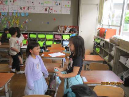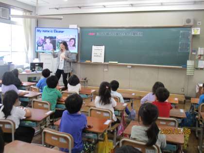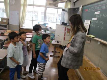 初めての外国語の学習がありました。この日は特別にALTのエレナ先生が来て下さって,一緒に挨拶の仕方や気持ちの伝え方などを学習しました。「ハローソング」という歌を振付けを付けて歌うことも楽しくできました。