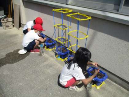 1年生は「あさがお」、2年生は「ミニトマト」を栽培しています。