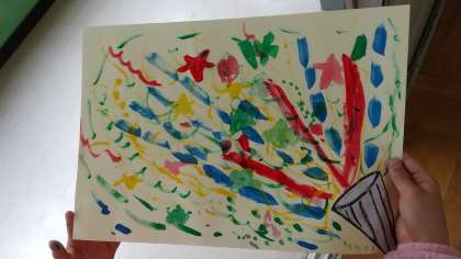 クラッカーから飛び出すテープや紙吹雪を、絵の具で表しました。