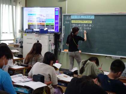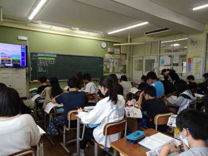 6年生の教室では、社会科で「子育て支援の願いを実現する政治」の学習をしています。とても難しそうな内容ですが、みんな真剣に先生の話を聞いたりノートを書いたりしています。一生懸命に学習する姿、キラキラと輝やいていますね!