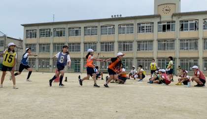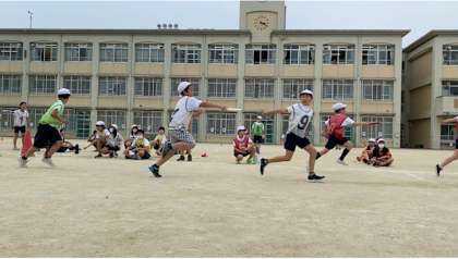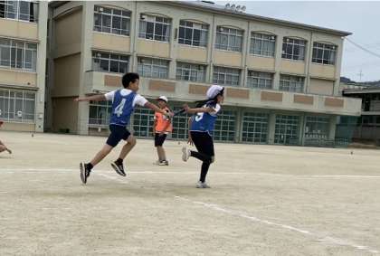 バトンパスを工夫することでタイムが縮むことがわかり、バトンを渡す人と受け取る人がスピードを落とさずにバトンパスできるように工夫して、行っています。