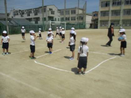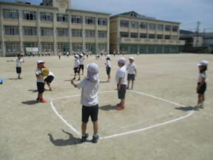 体育のボール遊びの様子です。2人組で転がしたりパスをしたりして練習して上手になってきました。最後に真ん中の友達に取られないように4人でパスをしました。最後のふりかえりでは、「山みたいに上にボールを投げたら取られなかったよ。」などと感想が出ました。