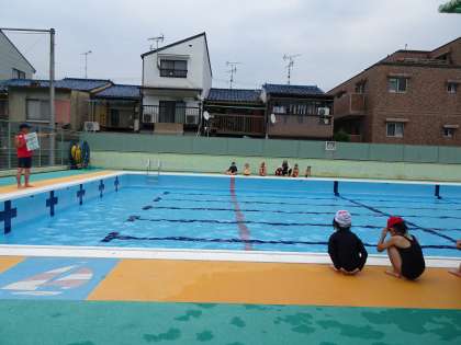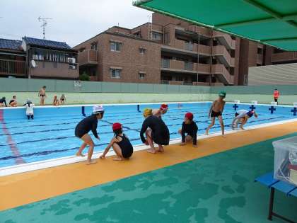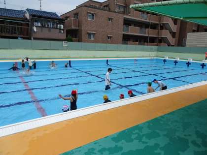 天候が危ぶまれる中、プールで水慣れを行いました。5校時だったので、1年生も一緒に入ることができました。プールに入るときの注意点など事前に学んだことを頭に入れて活動することができました。