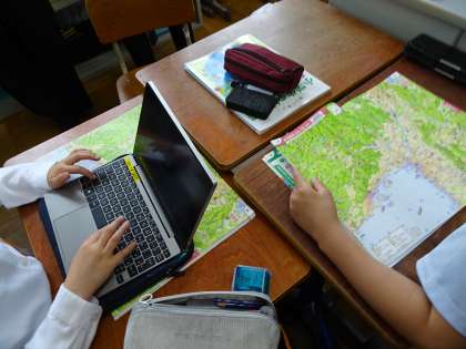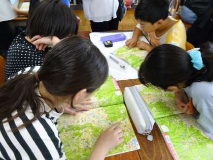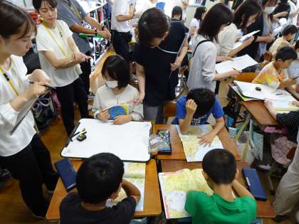 一人一人で予想をした後は、グループで話し合いをして予想をしています。地図帳、GIGA端末、国語辞典など、いろいろ使って、グループごとにしっかり話し合っています。