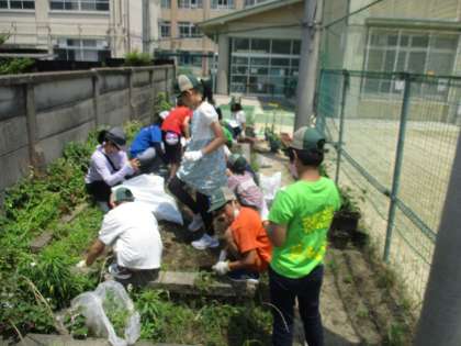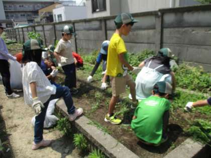大根を育てた畑の草引きをしました。この後は、夏野菜(サニーレタス等)を作る予定にしています。子どもたちは、一所懸命に雑草と向かい合って草を引き抜いていました。次は、みんなで力を合わせて土を耕していく予定です。