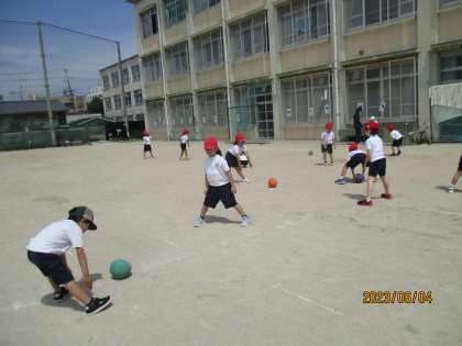 「まねっこぼおるあそび」でボールを転がす学習をしました。相手のいるところに転がすこと・だんだんと勢いをつけて転ばすことを意識して上手に転がしていました。