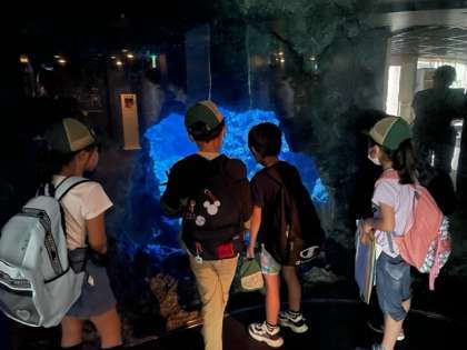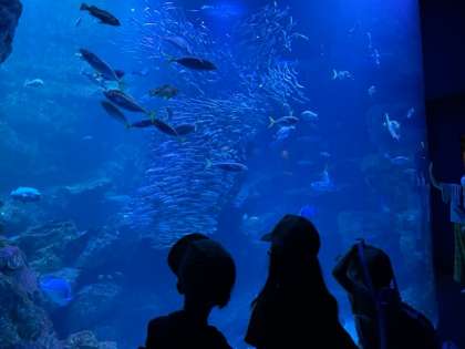 京都水族館の中で一番大きな大水槽を前に、エイやイワシの大群を見つけました。