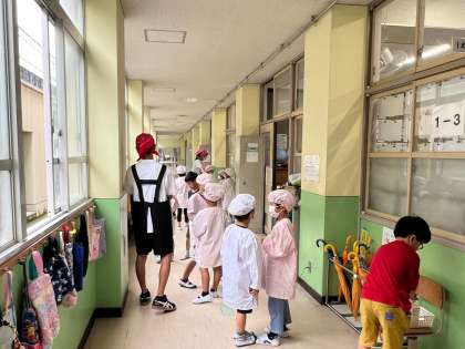 教室でいっしょに学習・・・しゃがんで、児童の目線と合わせて声をかけたり、そばであたたかく見守ったり、給食当番をいっしょにしたり・・・しっかり職業体験活動ができています。