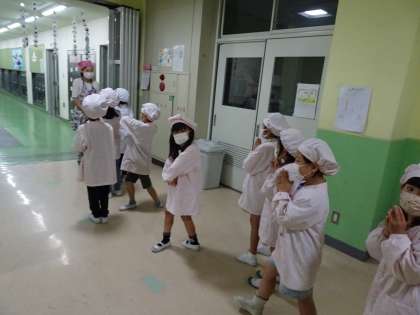 給食前にいると、いつも通り給食当番が給食を取りに来てくれました。あれ?今日は今までに見たことのない献立があるよ。何かな?