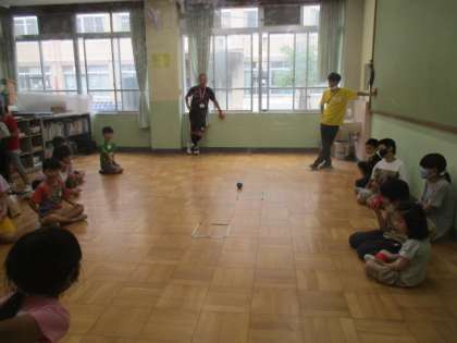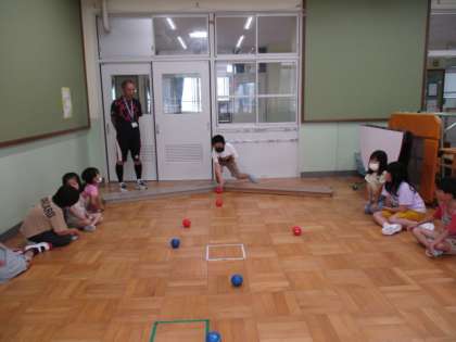 雨で水泳学習が中止となり、リラックスルームで「ボッチャ」をしました。わかばの体育の基本的なめあては「一生懸命取り組んで楽しもう」です。今回は、1組対2組の対戦形式で3試合行いました。対戦では、1組の2勝1引き分けで、総得点では1組が3点、2組が0点でした。
