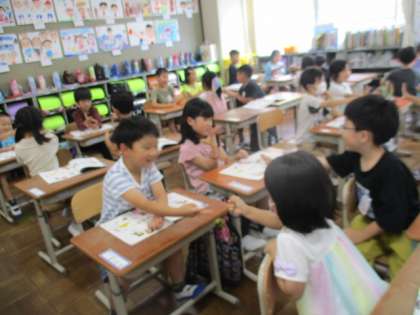 音楽の教科書にある「じゃんけんぽん」の歌をうたっているところです。この歌がとても好きです。お隣の友だちや同じ班の友だちとじゃんけんをして楽しんでいます。