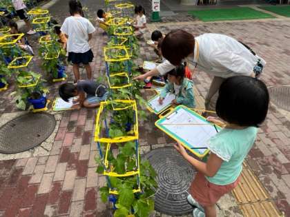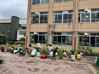 3時間目に中庭で1年生が学習しています。生活科の学習で大切に育てている、「あさがお」の観察をしています。今日は、GIGA端末を使わずに、紙の観察カードに鉛筆でていねいに、あさがおの成長の様子を記録しています。