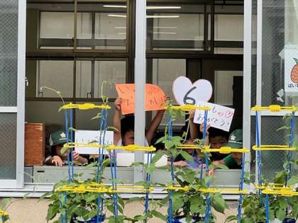 中庭で「出発式」をしていると、1年生の教室の窓から、かわいいお見送りが…。