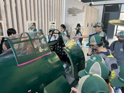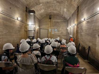ヘルメットをかぶり、巨大防空壕シアターに入ったり、「対空機銃座」や「戦闘機の操縦席」も見学したりました。