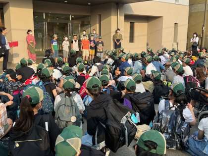 ホテルに到着しました。ホテルの玄関前で「入所式」を行いました。入所式は、班のリーダーが児童を代表して、進行をしました。ホテルの方にも、しっかりと挨拶ができていましたよ。