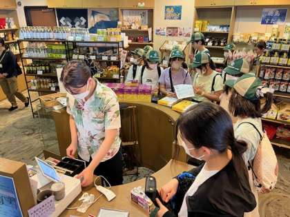 退所式の後は、鳴門公園でクラス写真の撮影と、お土産の買い物です。今回の買い物では、鳴門公園前のお土産物屋さん2店舗とホテルの売店のどこでも買えます。みんな、友だちと楽しくお土産を選んでいます。