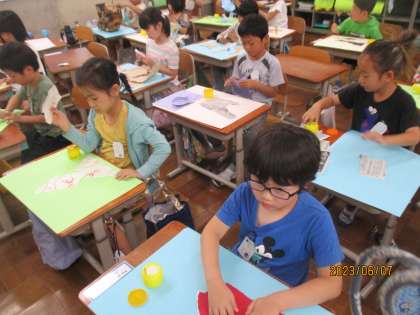 ビリビリ破った包装紙や紙袋を画用紙にペタペタ・・・思い思いに貼りました。「早く色を塗りたい!」と次の時間を楽しみにしていました。