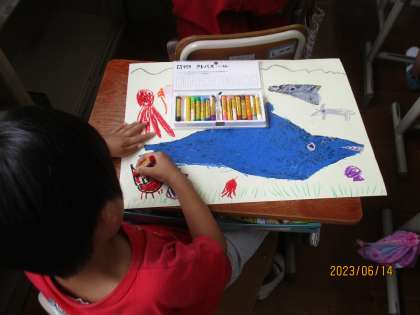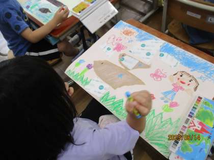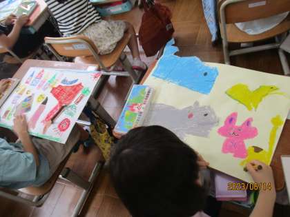 ペタペタ貼った作品にクレパスで付け足しをしたり色を塗ったりしました。「わたしは海がテーマだから海の生き物を描くよ。」「わたしは動物園だから動物をたくさん描くよ。」とそれぞれのテーマで描き,それぞれの思いの詰まった素敵な作品が出来上がりました。