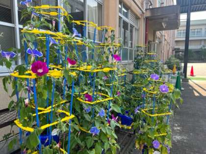 今日も青空でとてもいいお天気です。1年生が生活科で育てているアサガオも、きれいな花を咲かせています。