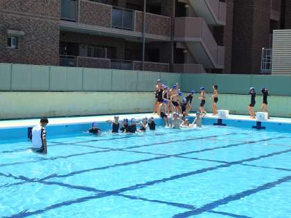さすが5年生です。シャワーを浴びた人から順にプールに入り、身体を水に慣らすために、水慣れをして体ならしをしています。