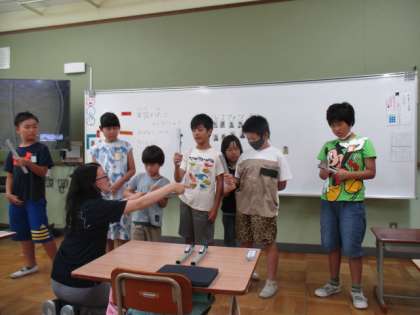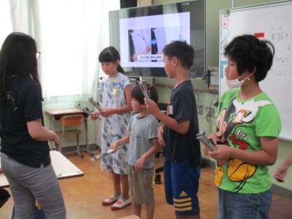 片手で縦向けに持ち、上に押し出すように動かして鳴らします。
