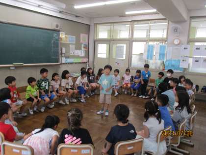 6月からクラスで係活動を始めました。「みんなあそび」「おたんじょうび」「ゲーム」「パーティー」「なぞなぞ」「ダンス」「かざり」「イラスト」という8つの係をみんなで決め,活動日も決めて毎月取り組んでいます。6月は,前に出るのが恥ずかしかったり,話し方がわからなかったりする子もいましたが,7月の活動では堂々とお話をしたり活動を進めたりする姿がたくさん見られてきました。2学期も楽しんで活動を進めてほしいです!