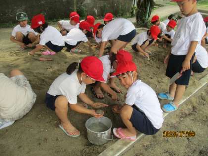生活科の「なつだ とびだそう」という学習で,「砂場遊び」をしました。砂場遊びでは,泥だんごを作ったりお山を作ったり,友達と一緒に楽しく活動ができました。