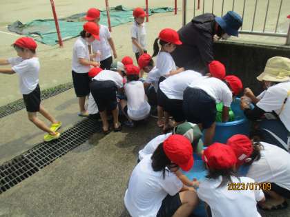 「なつだ とびだそう」という学習で,「水遊び」もしました。水遊びでは,マヨネーズなどの空容器に水をたくさん入れて友達と水のかけ合いを楽しみました。ビショビショになりながらも,「めっちゃ楽しい〜!!」とにこにこ笑顔の子ども達でした。