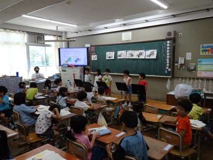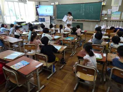 1学期の最終日、1時間目の終業式の後は、1年生も各教室で学習しています。国語や音楽、学活で夏休みの安全なくらしについて学んだりしています。