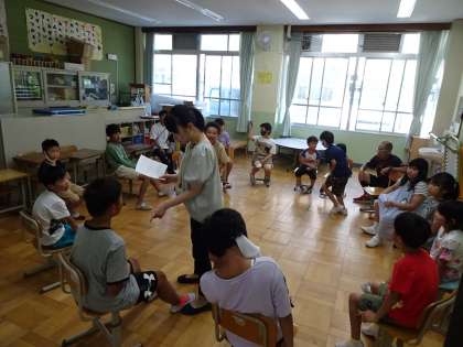 わかば学級のみんなが、わかば3教室に集まっています。お楽しみ会で「フルーツバスケット」をしています。みんなで楽しくね!
