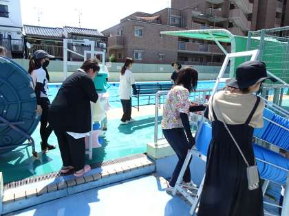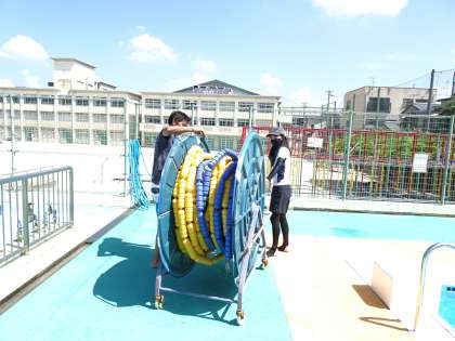 先生たち、プール前に集まっています。けっして、これから水泳大会をするわけではありません。先生たちは、また来年、子どもたちがプールを気持ちよく使えるように、プールの後片付けや、更衣室等の掃除をしているのです。プールを使い終わった後、どんな作業があるのか、少しみてみましょう!