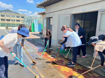 先生たちは、更衣室前の地面もきれいに掃除しています。最後にベンチやすのこなど、水泳学習中に使用していた物品を更衣室の中に片づけて、作業は終了です。