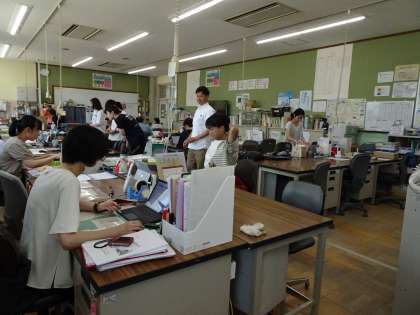 教室や廊下は、静まり返っていますが、職員室は先生たちでにぎわっています。