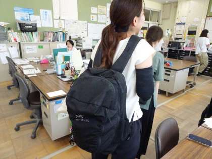 どの先生も職員室でそれぞれ、仕事に励んでいるようです。と思ったら、大きなリュックサックを背負っているK村先生・・・登山にでも行くのかな?