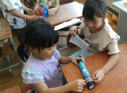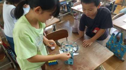 夏休みにそれぞれが作ってきた作品を交流しました。どのクラスも力作揃いで、「どうやってつくったの?」「ここのしかけ、すごいね!」などと、友達の作品を楽しく見合っていました。お家での取組、ありがとうございました。