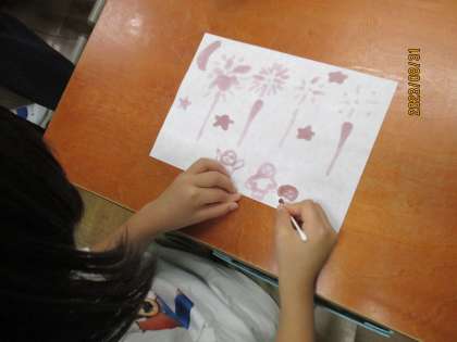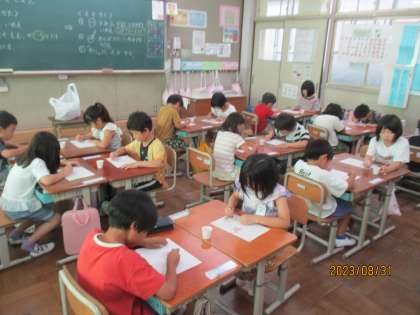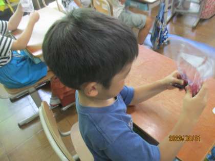 生活科の学習で,あさがおの花を使って色水遊びをしました。お家から持ってきたあさがおの花の入った袋に少し水を入れてもみもみ・・・できた色水を紙コップに入れて,綿棒を使って和紙に絵を描きました。お友達同士で協力してあさがおの汁を絞ったり,できた色水を2人で仲良く使ったり・・・とほほえましい姿がたくさん見られました。保護者の皆様,あさがおの水やりや花つみにご協力いただきましてありがとうございました。