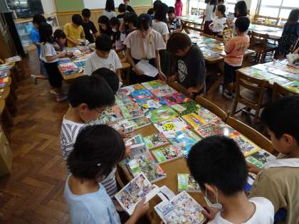 「選書会」を行いました。選書会とは、書店からお借りした新しい本を並べて、児童が実際に本を手に取って、見て、図書館に新しく購入してほしいと思う本を選ぶ会です。今年はわかば学級と、2・4・6年生の児童に本を選んでもらいました。