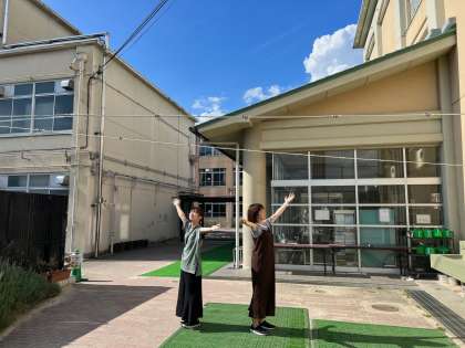 (写真)ミストシャワー設置時に、あまりにも気持ちよくて、思わず踊りだす教職員です。