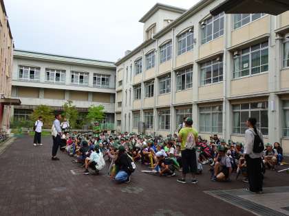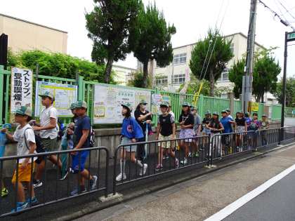 5年生のみんなが、中庭に集まっています。校帽をかぶって正門から出ていくようです。5年生のみんなは、どこへ行くのかな?
