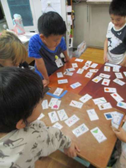 暑くて外で遊べない日の教室の様子です。ひらがなカルタで盛り上がっていました!