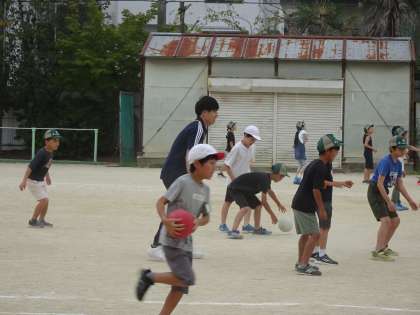9月26日(火)中間休み「先生たちも、子どもたちと運動場で元気よく遊んでいます!」