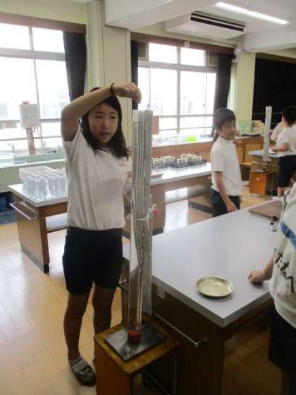1mのつつに水を入れて上から食塩をパラパラ入れてどのように溶けるのか実験しました。