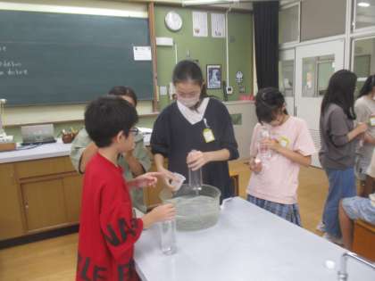 水上置換で上手にペットボトルに二酸化炭素を集めていました。少し難しそうでしたが、とてもスムーズに協力して進めていました!