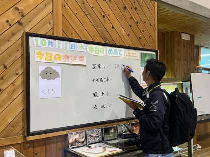 ? 子どもたちが歯磨きや荷物整理をしているとき、先生たちもいろいろな仕事をしています。M井先生は、山の家の職員の方と打ち合わせをしたり、今日のめあてをホワイトボードに書いたりしています。