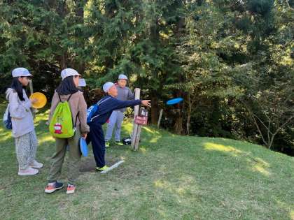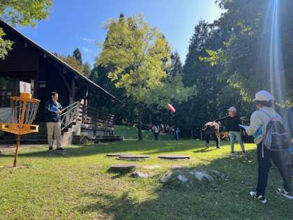 グループごとにコースへ出発です。ディスクは思いがけないところに飛んで行ったり、時には屋根の上にのったり…うまくいかないことはあっても、みんなで楽しそうに活動できています。