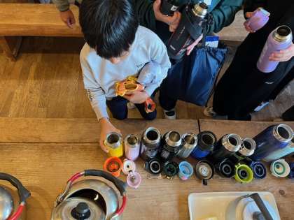 食事の前は、手をきれいに洗うことはもちろんですが、山の家では、水筒の中を空にして、水筒もきれいに洗ってから食堂に入ります。