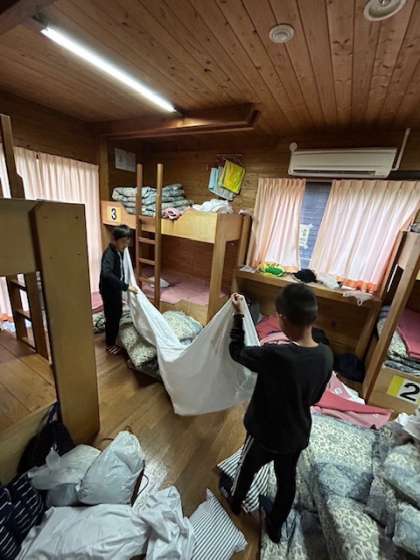 6時に起床時刻を知らせる音楽が各部屋に流れています。みんな、ぐっすり寝られたようですが、2日目よりも、みんなの動きが少しゆっくりなようです。それでも、協力してシーツをたたんだり歯磨きをしたり…準備を進めています。