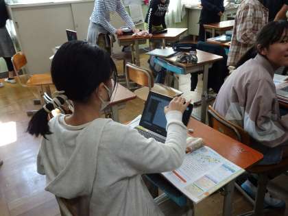 6年生は、社会科の時間にもGIGA端末を使って、調べたことや考えたことをGIGA端末に入力しています。これまで通り紙のノートに書いている児童もいます。子どもたちは、自分で考えて、GIGA端末と紙のノートをうまく使い分けています。