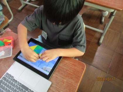 算数で「かたちづくり」の学習をしています。ロイロノートと色板を使って,影絵の上に色板を置き,どんな並べ方ができるか・色板何枚でできるかを考えました。色板をどのように並べたかを線を引いて表し,提出をしました。