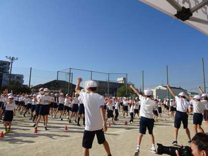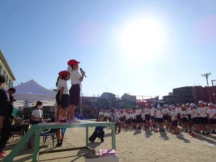 雲一つない青空のもと、開会式を行いました。1年生が、はじめの言葉をかわいく言ってくれました。そのあと全校児童で、準備運動をしました。
